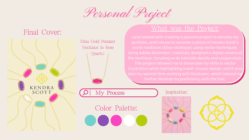 For this Motion Graphics class assignment, I was tasked with creating a 404 error page that transforms the usual frustration into an engaging and memorable experience. Using Adobe After Effects, I designed the page for Kendra Scott, drawing inspiration from their Elisa necklace and the “Hey Elisa! An Icon Goes on Tour” campaign. This project allowed me to explore the intersection of design, animation, and storytelling, creating a 404 page that reflects the brand’s personality while offering an interactive moment for users.